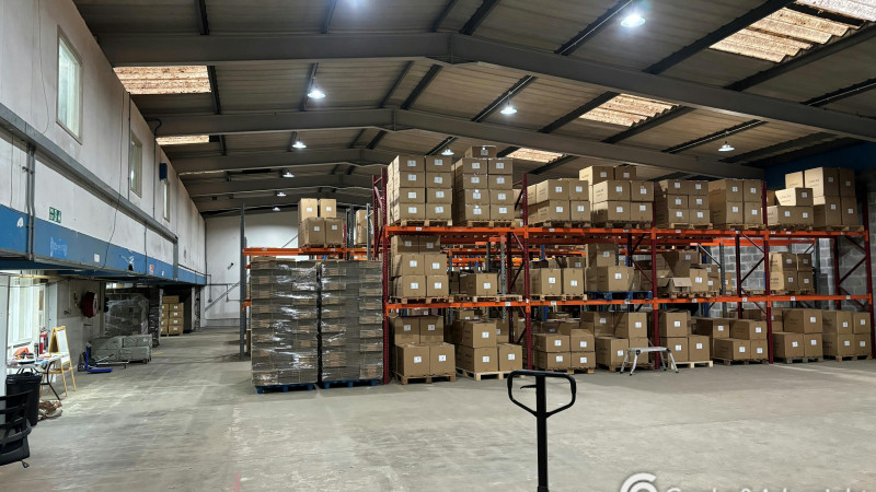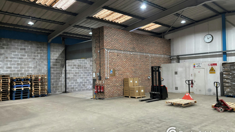 The property is of steel portal frame construction, with brick elevations to circa 2 metres and steel sheeting to the remainder. The roof is pitched and clad with steel sheeting. Access is provided via an electronic roller shutter door at the front of the site, with a pedestrian access on the eastern side of the unit. Internally, the unit presents well, with the warehouse providing storage and distribution space, alongside a number of small storage rooms/offices which run across the eastern elevation. There is a mezzanine above this, which provides further office and welfare space. The unit has an eaves height of 4.45 metres rising to an apex of 5.47 metres